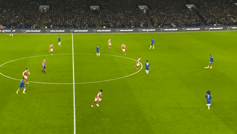 这次进攻包含了切尔西形成菱形中场时的四名中场中的三位。中卫韦斯利-福法纳将球传给9号位马克-吉乌,从而分开了中场,吉乌再将球做给10号位若昂-佩德罗。